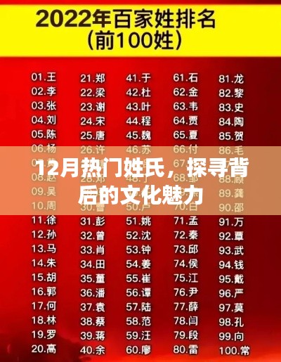 隨著年末的到來,各種年終盤點和熱門榜單紛紛出爐,在這其中,姓氏作為承載家族榮譽和文化傳承的重要符號,總能引起人們的廣泛關注,本文將為您揭曉在12月備受矚目的熱門姓氏及其背后的文化魅力。